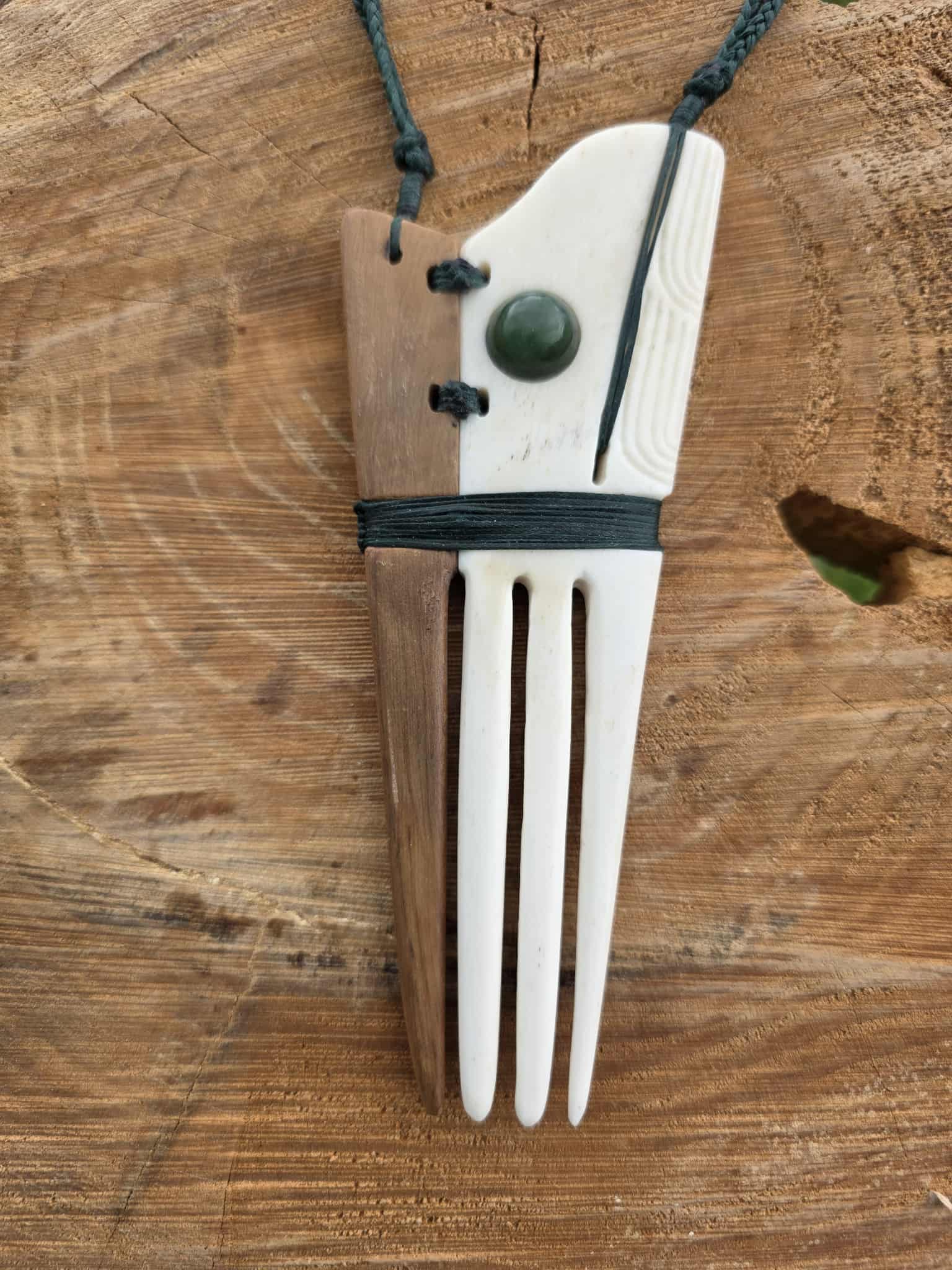 The heru necklace is a stunning piece, blending natural materials and thoughtful design. The pendant features a curved white bone, flanked by warm brown wood, and accented with dark green lines and a polished green stone cabochon. Delicate dark green cord work adds an organic touch, reflecting a deep connection to nature and cultural heritage. This unique heru is a beautiful representation of traditional craftsmanship, perfect for those who appreciate the stories and meanings woven into each piece